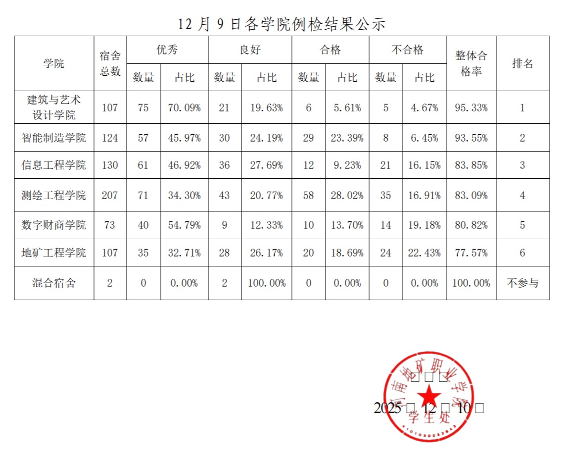 2025 年 12 月 9 日,学生处组织开展公寓安全与卫生综合例检,本次公寓例检由 32 名学生和老师组成,分别对 1号公寓、2 号公寓、3 号公寓一单元、3 号公寓二单元、4 号公寓共 750 间宿舍开展检查,现把检查结果相关情况通报如下: