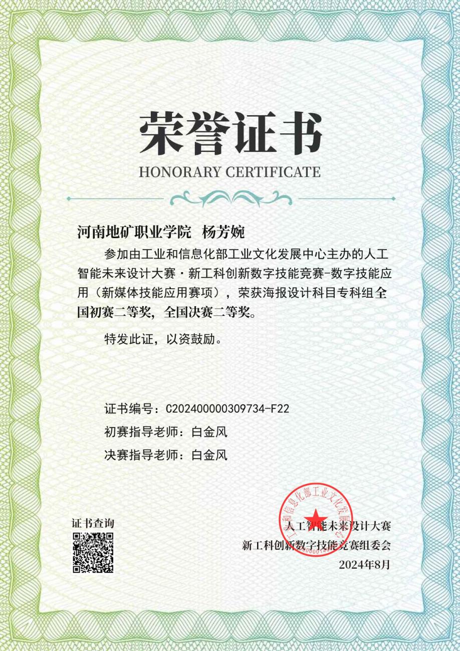 个人简介:杨芳婉,女,共青团员,河南地矿职业学院23级数字媒体技术2班学生,2024-2025学年平均绩点4.23,在校期间获得人工智能未来设计大赛海报设计全国决赛二等奖、大学生数字技能大赛全国初赛二等奖、校“优秀大学生记者”、“思政课学习标兵”、“三好学生”、“优秀班干部”、“优秀社团积极分子”等荣誉。