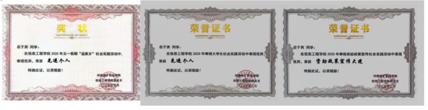 岳于芮同学坚信,大学是一片广阔无垠的试验田,是探索无限可能、实现全面发展的黄金时期。她积极投身于各类校园文化活动和学科竞赛中,屡获佳绩,综合能力得到显著提升。她是能言善辩的思想传播者。她具备出色的语言表达能力和逻辑思维。在2024年10月学院“中华民族一家亲,同心共筑中国梦”演讲比赛中荣获一等奖,并在2025年5月校级“传承红色基因,学思践悟中国共产党人精神谱系”演讲比赛中荣获三等奖,用声音传递了深厚的家国情怀与坚定的理想信念。她是知行合一的未来规划师,她注重职业发展,早早进行生涯探索。在2024年11月学院第二届职业生涯规划大赛中荣获二等奖,并在2025年4月的简历制作大赛中获三等奖,展现出对个人未来发展的清晰思考和充分准备。她是创意无限的专业实践者,作为数字媒体技术专业的学生,她充分发挥专业特长。在“魅力校园-创意无限”文化创意设计比赛中斩获一等奖,在春日校园艺术创作大赛中获三等奖,体现了出色的创意设计和艺术审美能力。个人的能力终有穷尽,团队的力量方能行稳致远,她具有较强的团队合作精神。在2024年河南省高等职业教育技能大赛校园安全教育情景剧比赛中,作为团队一员,她善于倾听,乐于配合,她积极参与各项任务,贡献智慧与汗水,最终她们团队荣获团体二等奖,为学校赢得了荣誉。